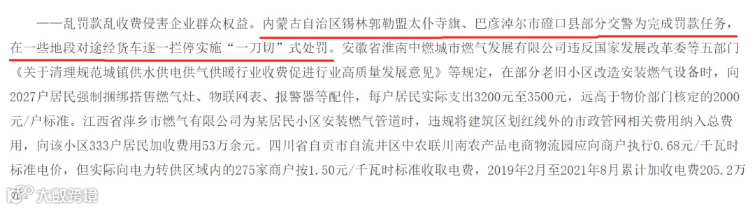 内蒙古自治区锡林郭勒盟太仆寺旗、巴彦淖尔市磴口县部分交警为完成罚款任务,在一些地段对途经货车逐一拦停实施“一刀切”式处罚。