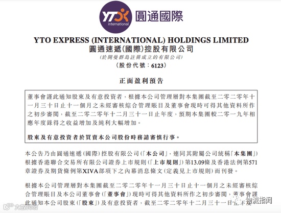 圆通速递国际:预期2020年纯利同比增加不少于600%