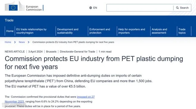 欧盟贸易总局(Directorate-General for Trade)正式发布“欧盟委员会保护欧盟工业在未来五年内免受PET塑料的倾销”的通告,欧盟委员会对从中国进口的某些聚对苯二甲酸乙二醇酯(PET)征收明确的反倾销税,以保护欧盟公司和1500多个就业岗位。欧盟PET市场价值超过55亿欧元。欧盟委员会确认于2023年11月27日起征收临时关税,税率由6.6%至24.2%不等,根据出口生产商的不同而定。这些关税将持续5年。