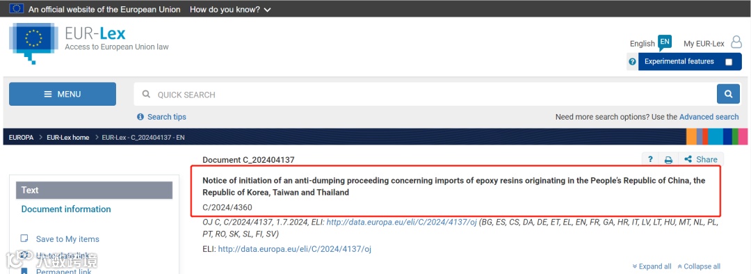 欧盟又对我国发动反倾销调查了!据消息,2024年7月1日,欧盟委员会启动对中国、韩国、中国台湾和泰国环氧树脂进口产品的反倾销调查。