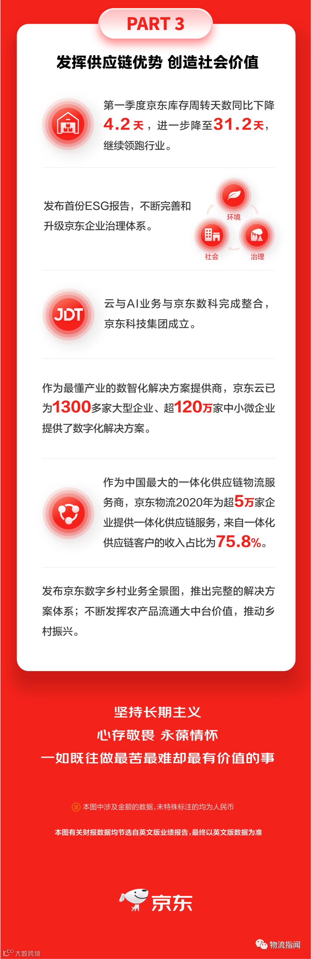 在2021年第一季度,数十万品牌和商家在京东平台上的销售保持高速增长势头,京东持续的技术创新和开放服务,也带动了合作伙伴运营周转效率显著提升。京东集团的库存周转天数进一步下降至31.2天,同比去年一季度大幅下降了4.2天,创下了比往年消费旺季更快的库存周转天数纪录,这不仅有利于降低京东的库存成本,也有助于带动合作伙伴提升运营效率。