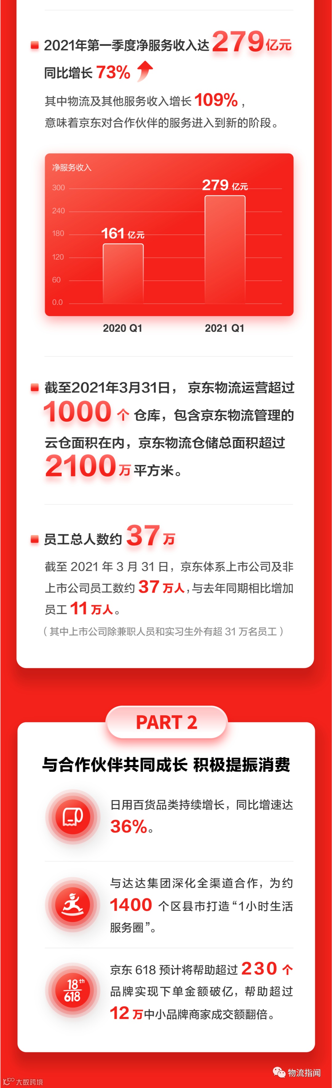 2021年第一季度,京东集团净收入为2,032亿元人民币(约310亿美元),同比增长39%;净服务收入增长至279亿元人民币(约43亿美元),同比大增73%,其中物流及其他服务收入同比增长超过109%,显示出京东对合作伙伴的服务进入到新的阶段。
