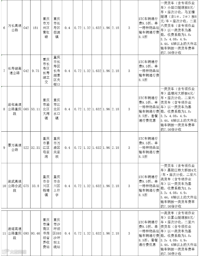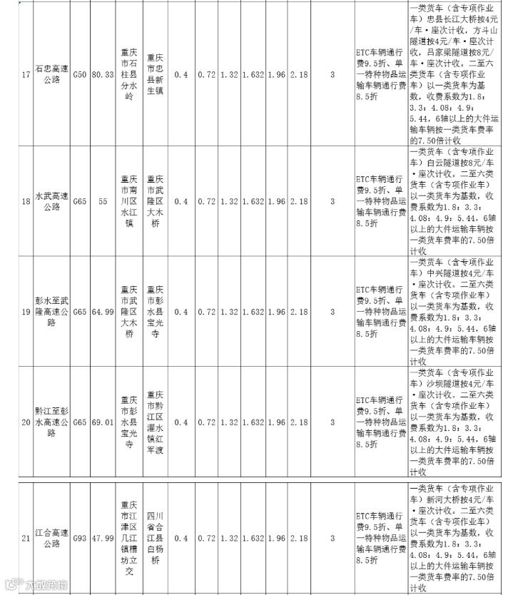 按照交通运输部统一部署,重庆再次调整4型、6型货车收费标准,收费级差系数调整为1.00∶1.80∶3.30∶4.08∶4.9∶5.44。