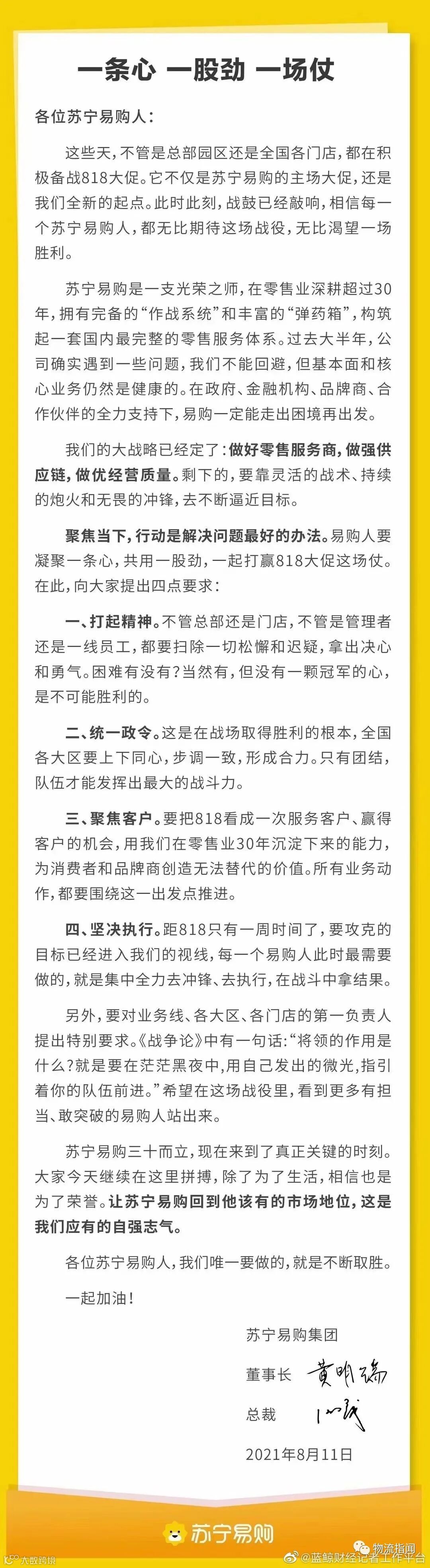 8月11日晚,苏宁易购董事长黄明端、总裁任峻致信全体苏宁易购员工,号召全员凝聚一条心,共用一股劲,一起打赢818大促这场仗。信中说,“行动是解决问题最好的办法,要让苏宁易购回到该有的市场地位。”