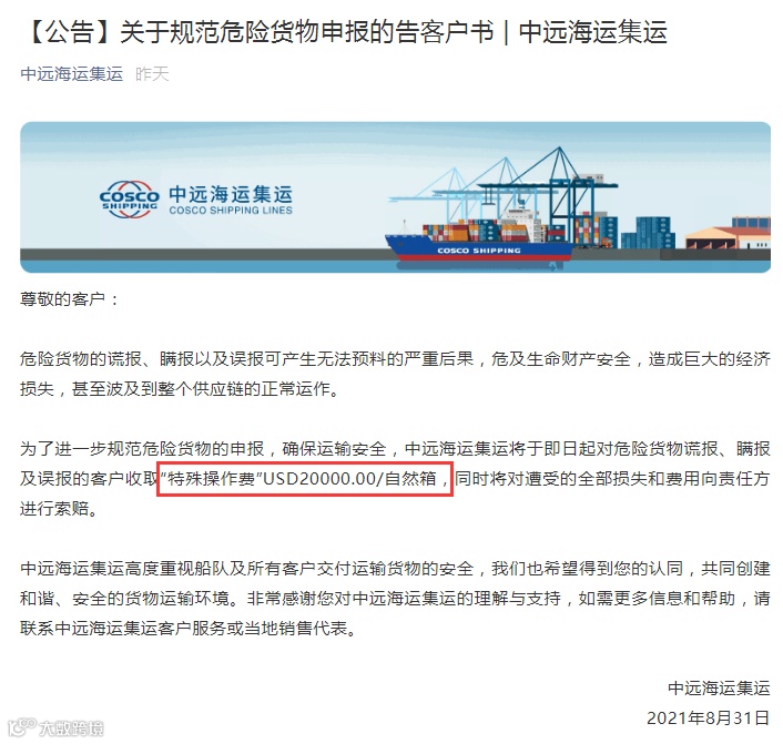 9月1日起,危险品瞒报误报罚20000USD/箱!又一船公司最新公告: