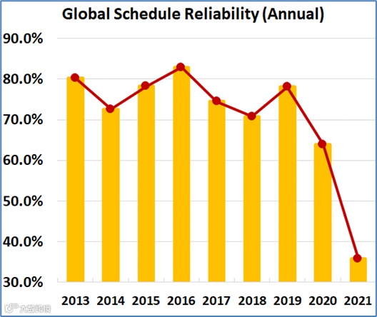 2021年紊乱的船期让众多贸易商和物流服务商深受其苦。根据海事咨询公司Sea-intelligence的数据,2021年的全球船期平均可靠性仅有35.8%,这是有记录以来的最低数字。而在疫情发生之前的2019年,这个数字是78%。