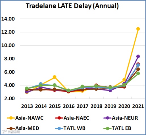 在延误方面,所有六条贸易航线都遵循相同的总体趋势。2021年,亚洲-北美西海岸的LATE船舶平均延误增幅最大,延误时间超过12天,而亚洲-北欧紧随其后,超过8天。