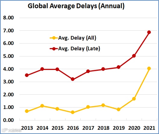 与暴跌的船期可靠性相对应的,是暴增的船舶平均延误天数。自2016年晚到船舶平均延误天数达到3.19天的低点以来,延误天数连年上升,到最严重的2021年上升到了6.86天。