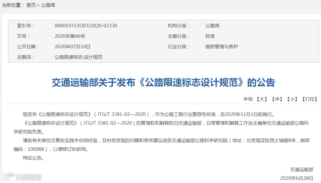近日,交通运输部就发布了《公路限速标志设计规范》公告,进一步规范全国高速限速标志设计,将于2020年11月1日起施行,届时不规范、不合理的限速标志将面临着拆除。