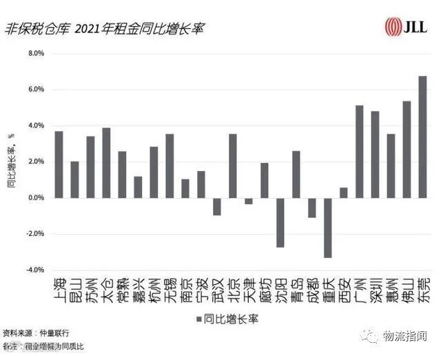 租金增幅呈区域不平衡反映局部地区超量供应对租金的挤压;华西地区需求趋于活跃,成渝两地租金同比跌幅收窄;华东个别子市场供应扎堆影响平均租金升幅;华南市场供不应求,大部分城市租金升幅大于5%;华北区各个城市租金表现不一,北京、青岛、廊坊保持正向增长。