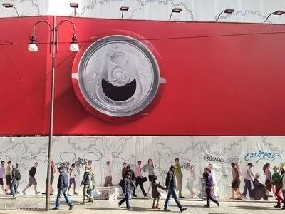 2013年的时候意大利政局、经济持续动荡。而可口可乐希望让人们快乐一点点,于是一个微笑的可乐罐横幅被挂到了户外,引发众多市民围观和分享。