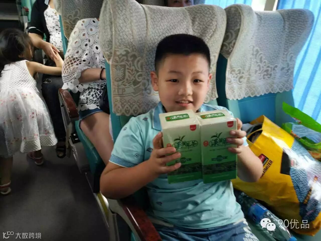 看,这小胖纸还拿了礼品哦,