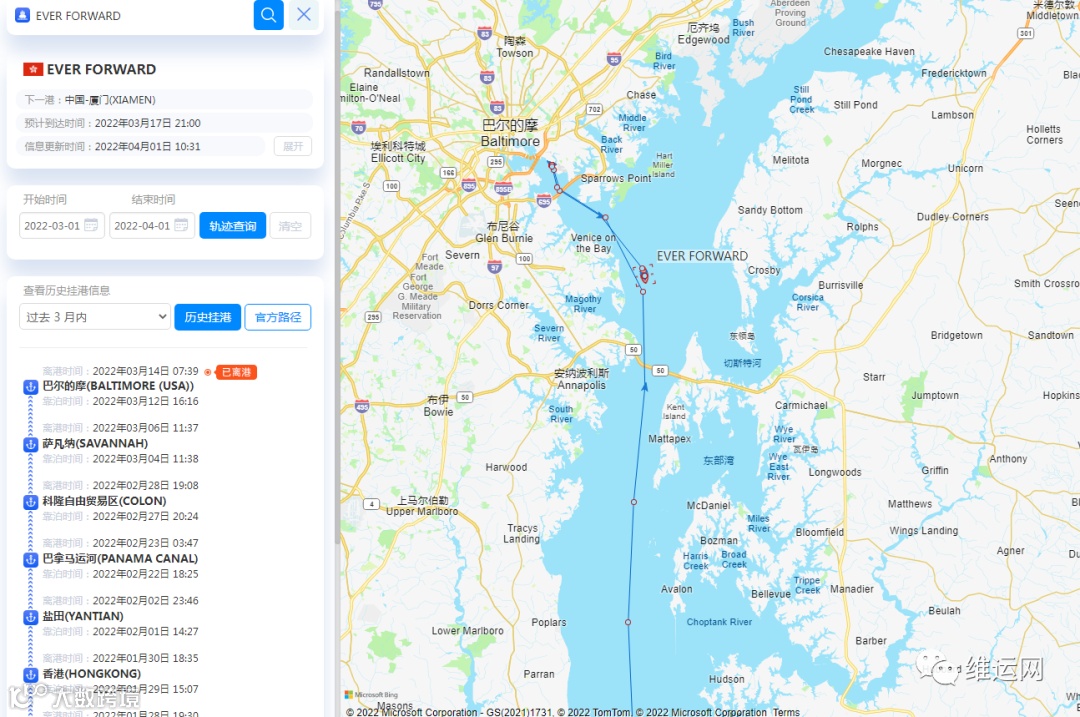 “Ever Forward”轮实时船舶定位查询