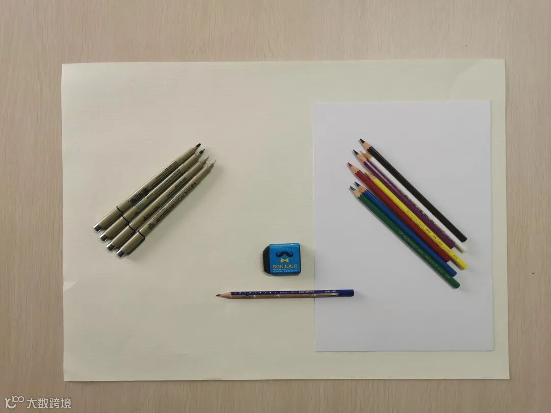 纸、铅笔、彩铅、勾线笔、橡皮