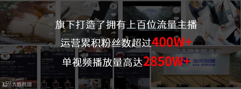 宁波海风互娱传媒有限公司,善于直播带货。从事短视频直播行业 3 年,具有丰富的直播带货经验。旗下拥有近千万粉丝矩阵账号,拥有包括“带你吃遍宁波”、“匠心宁波”、“旅在宁波”等多个本地化账号,累计粉丝近百万。海风互娱是宁波第一家抖音官方认证 MCN 机构,旗下拥有直属主播近 300 名,合作主播近千名,且与李佳琦、薇娅等头部主播保持良好合作关系。