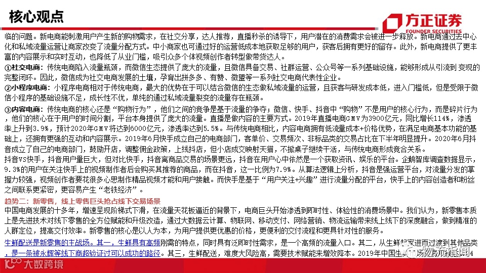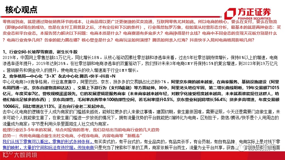 本报告努力解决以下问题:电商本质是什么?电商赛道有多宽多大?电商挣得是什么钱?电商中不同业态的变现天花板分别是什么?电商行业竞争几何?各家的能力圈在哪?核心壁垒是什么?电商玩法如何演绎?腾讯如何杀入红海?抖音快手入局对电商格局影响几何?