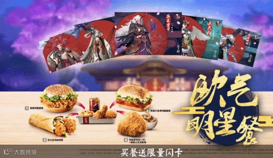4 月 1 日至 4 月 16 日,网易巨制《阴阳师》加入了肯德基豪华午餐。全国 5000 家线下门店,共推出 3 百万份主题套餐,其中每份主题套餐均含限量闪卡,每张闪卡内含 1-7 张现世召唤券(召唤券数量随机),绑定兑换码之后就有机会抽到 SSR。