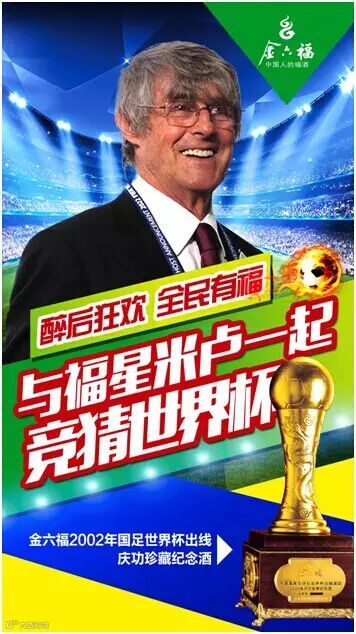 2002年,中国男子足球队世界杯出线,金六福邀请米卢为金六福品牌形象代言,推出国足世界杯出线专用庆功酒,成为日韩世界杯期间最亮眼的品牌。