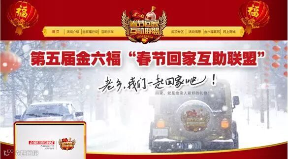 2011年春运期间,金六福发起国内首个由民间解决春运难题的公益平台——“金六福春节回家互助联盟”,以“老乡情结”为情感纽带聚集民间力量,鼓励老乡“互助拼车”回家,倡导绿色便捷的春节回家方式。