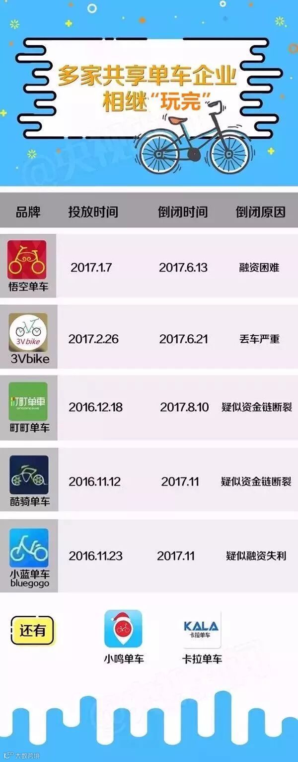至少7家共享单车企业“玩完”