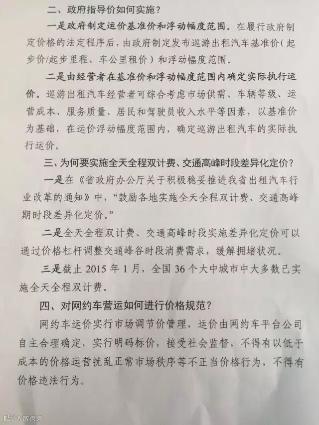 巡游出租汽车由原政府定价改为实行政府指导价,实施全天候全程双计费、交通高峰时段差异化价格政策。