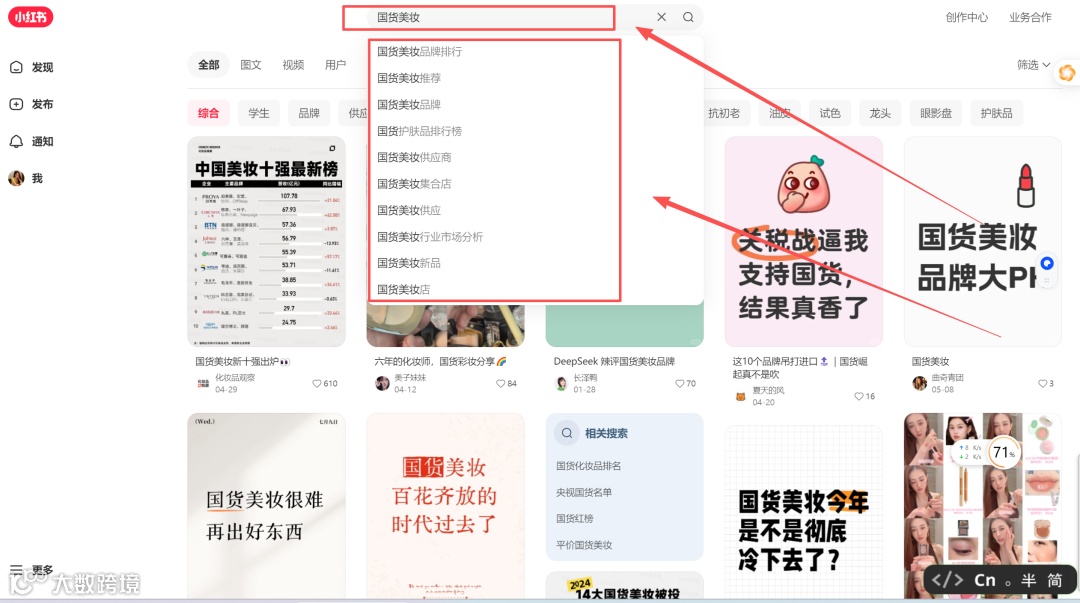 • 第一步:打开小红书搜索页,输入你品牌所在行业的核心词。比如花西子是做美妆的,就搜“国货美妆”“雕花口红”;认养一头牛是做乳制品的,就搜“常温酸奶”“早餐奶”。这里要注意,别只搜大词,还要搜长尾词,比如“适合黄皮的国货口红”“宿舍党能囤的常温酸奶”。 -