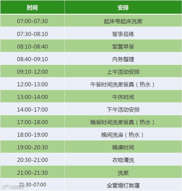 ※作息时间安排依据军队作息时间表根据青少年实际情况科学设置,帮助孩子调整科学作息,养成良好习惯。