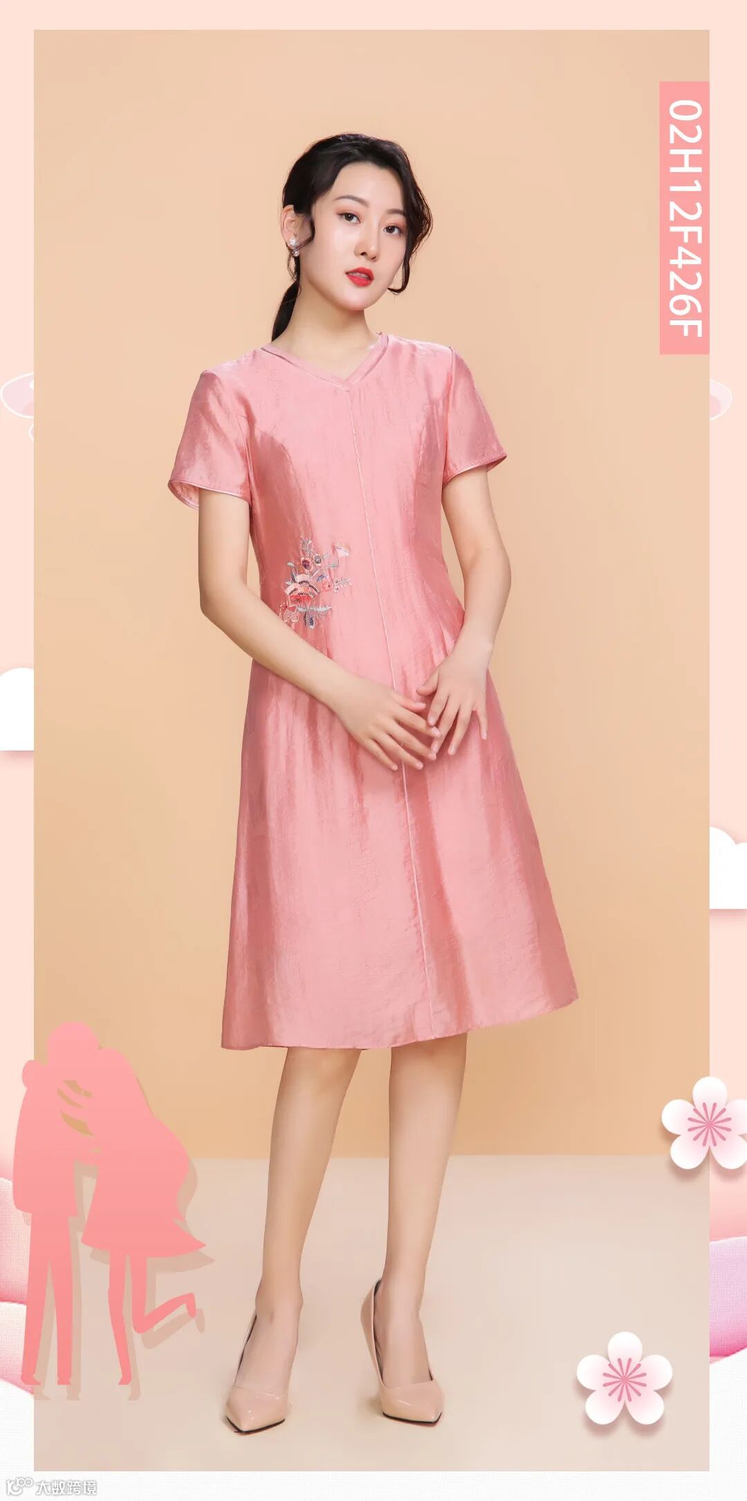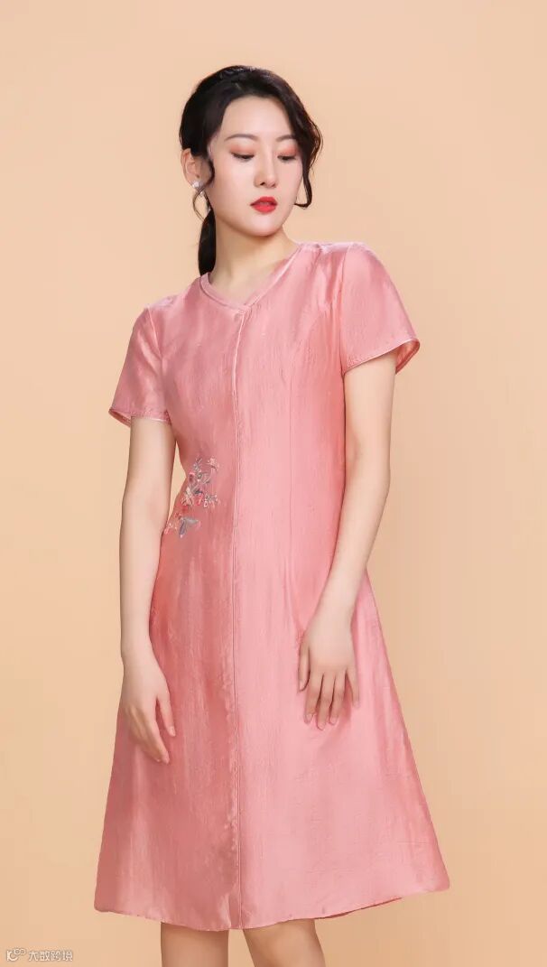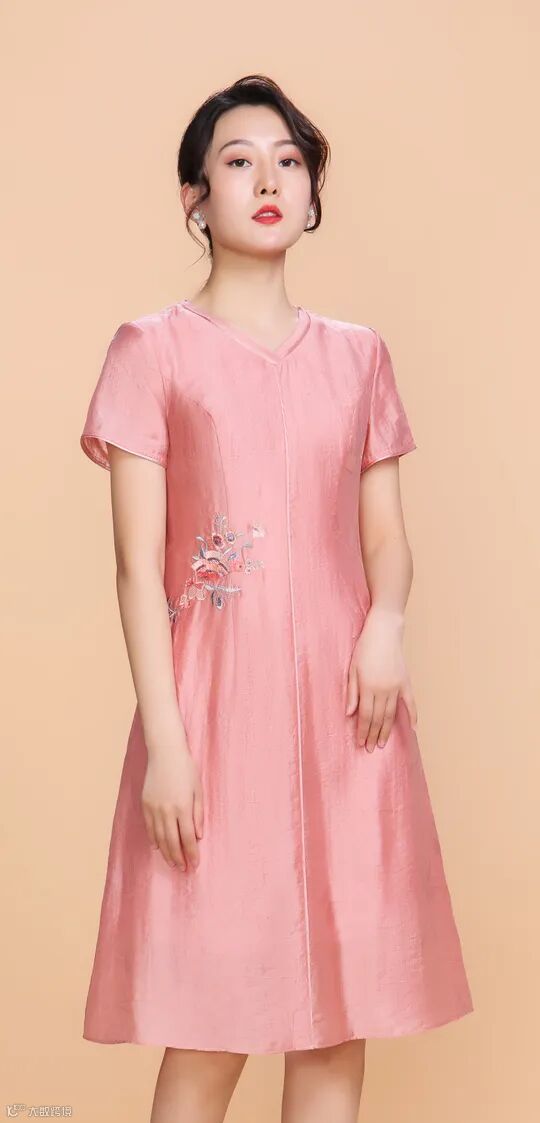 提花丝锦V领连衣裙,