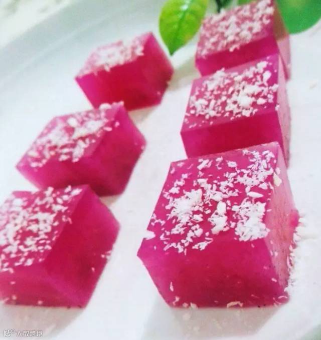 5. 最后,是考验刀工,自由发挥的时候了。将整块的布丁切成你喜欢的样子,也可以用心型磨具切成爱心的形状哦!并撒上椰蓉粉,一份美美的玉龙果布丁就做好了!