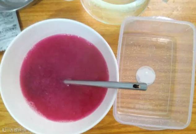 1. 一个红心火龙果,皮剥掉,切小块放入榨汁机里,榨好过滤掉黑色籽粒,最好的过滤方法是倒入少许加入清水,沉淀过滤。