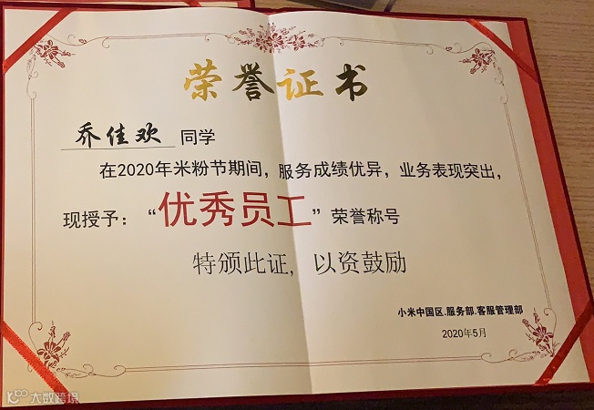 佳欢小仙女从去年618入职以来一直以优异数据示人,她的服务理念就是不管什么时候都要服务好每一位米粉大大。正是这个理念一直支持着她,让她一路披荆斩棘获得超预期表扬、服务达人等荣誉称号,在本次米粉节她更是以全线数据第二的好成绩获得“优秀员工”荣誉称号。