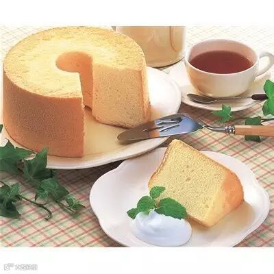 戚风蛋糕(Chiffon Cake) 美国的名产之一。戚风蛋糕的前身是海绵蛋糕(Sponge),它是种完全靠打发蛋(全蛋或是分蛋)来形成蛋糕组织孔隙的糕点,因此典型的海绵蛋糕材料只有蛋、面粉和糖这三样,区别就在于海绵蛋糕的口感比戚风蛋糕更结实、更绵密,不过在吃的时候很容易噎着(和戚风蛋糕相较的话)。由于口感和组织特别柔软绵滑,所以这种蛋糕就被命名为戚风蛋糕(名字里的“Chiffon”是“乔其纱”的意思,这是一种类似丝绸却不像丝绸般难保养的布料)。 戚风蛋糕其实就是改良后的海绵蛋糕,里面除了蛋、面粉和糖之外,还放了植物油和水(作用是增加组织湿度,使口感更蓬松湿润)。但是因为面糊比较湿、不容易膨胀的缘故,所以需要靠手工来帮助面糊发泡膨胀。此外,戚风蛋糕的面糊因为比较湿,所以烘烤时必需保证面糊可以攀着烤模壁往上爬升才行,否则烤出来的蛋糕会扁扁的,组织也会硬而没有孔隙。