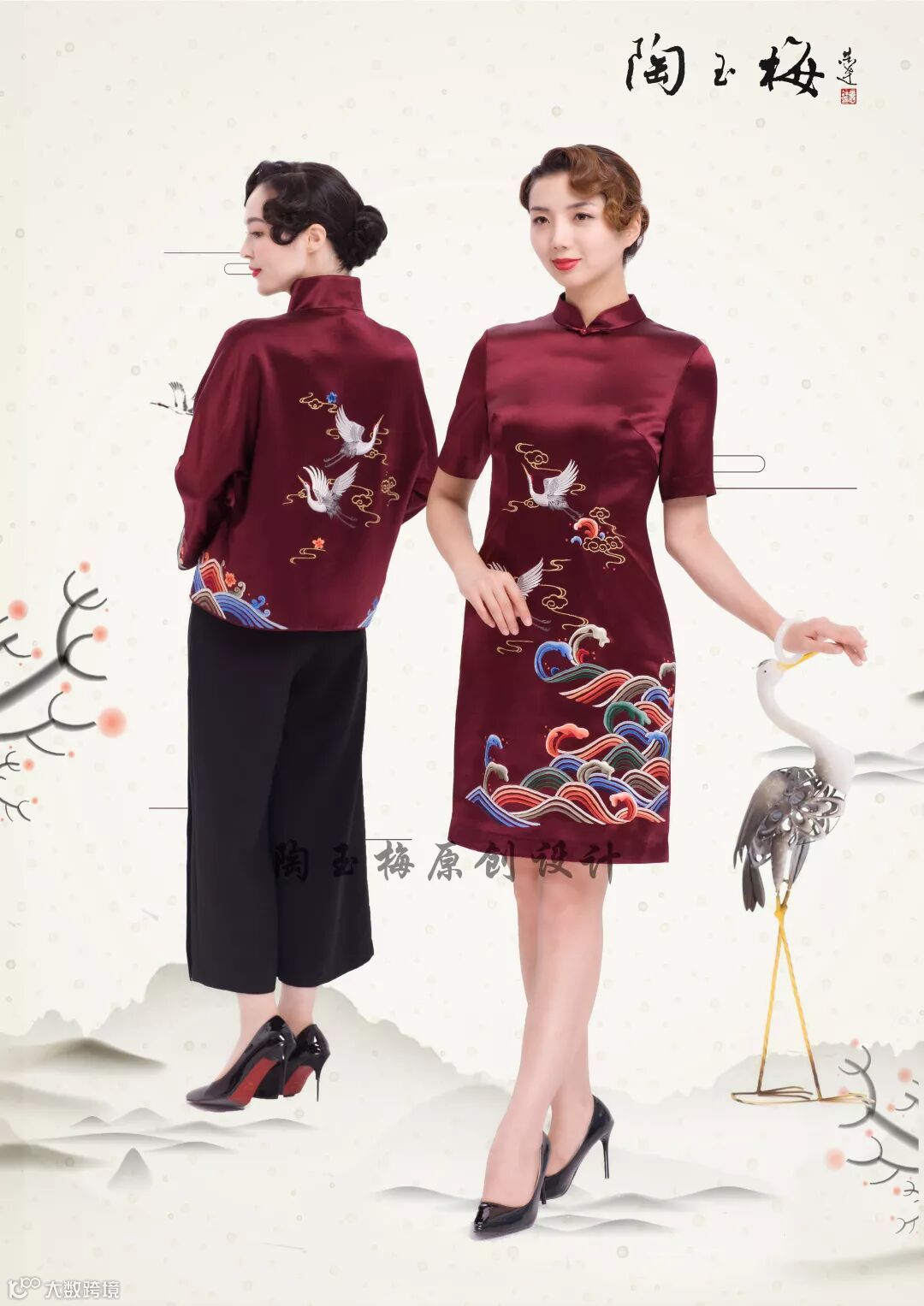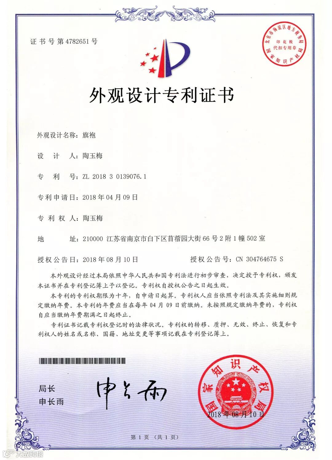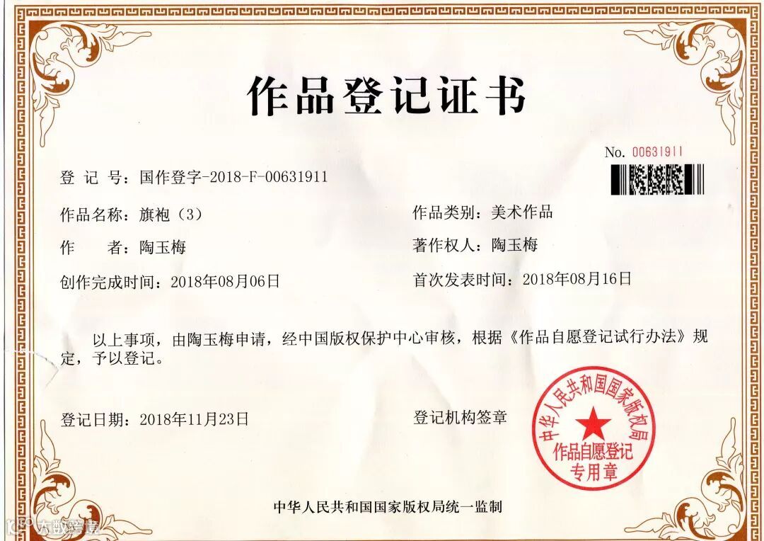 仙鹤图案作为传统吉祥寓意图案,被较多的运用在旗袍及配搭服饰品类上,陶玉梅品牌为保护著作权,已将仙鹤图案延伸作品分别申请了“作品登记证书”以及“外观设计专利”。