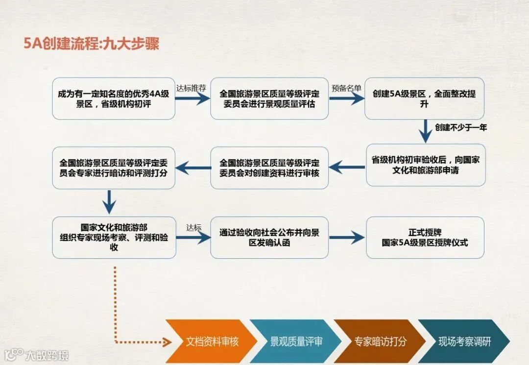 5A景区创建共九大步骤。其中景观质量评定报告是创建大门开启的敲门砖。