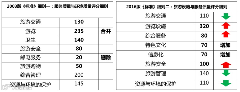 对比两版标准,差异性主要体现景区时代发展趋势和新发展要求。一是,为了与现有的创A的评定程序相适应,新标准将细则一(《景观质量评分细则》)与细则二(《服务质量与环境质量评分细则》)位置互换。