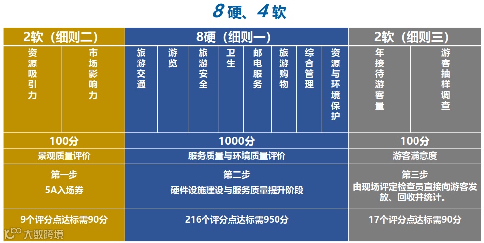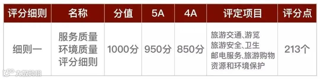 其主要考察景区的服务质量与环境质量,针对旅游交通、游览、旅游安全、卫生、邮电服务、旅游购物、资源和环境保护等八个大项共213个小项进行评分,满分1000分的情况下,必须达到950分。