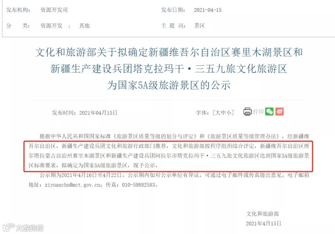 文化和旅游部关于拟确定新疆维吾尔自治区赛里木湖景区和新疆生产建设兵团塔克拉玛干·三五九旅文化旅游区为国家5A级旅游景区的公示