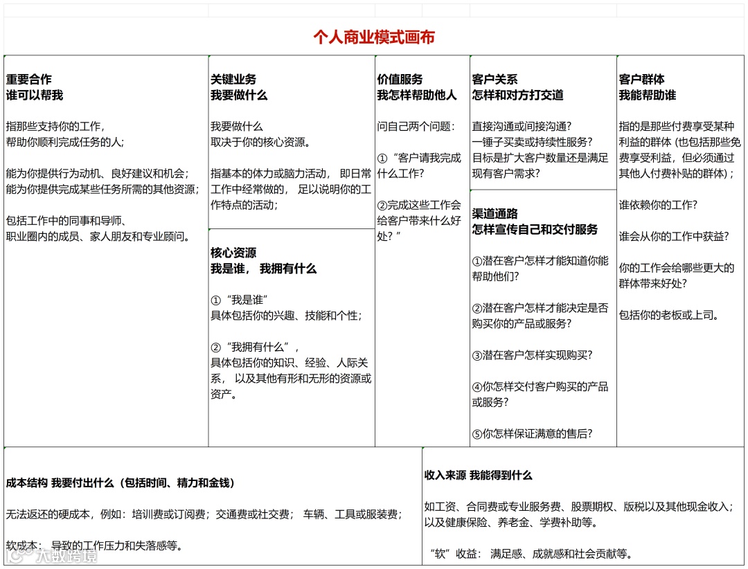 最后,我给大家分享一个《个人商业模式画布》表格,希望你能够清晰了解自己的优势与定位,学会相信自己,坚定自己。
