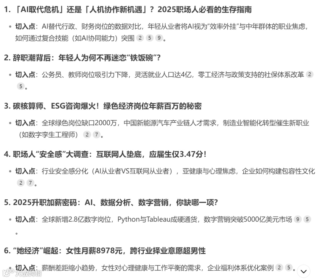 你还可以更具体一点,输入 “2025 年适合职场新人的热门技能学习方向”,它就能帮你找到像 “Python 编程在职场中的应用”“职场必备的 PPT 制作技巧” 这些既热门又实用的选题。