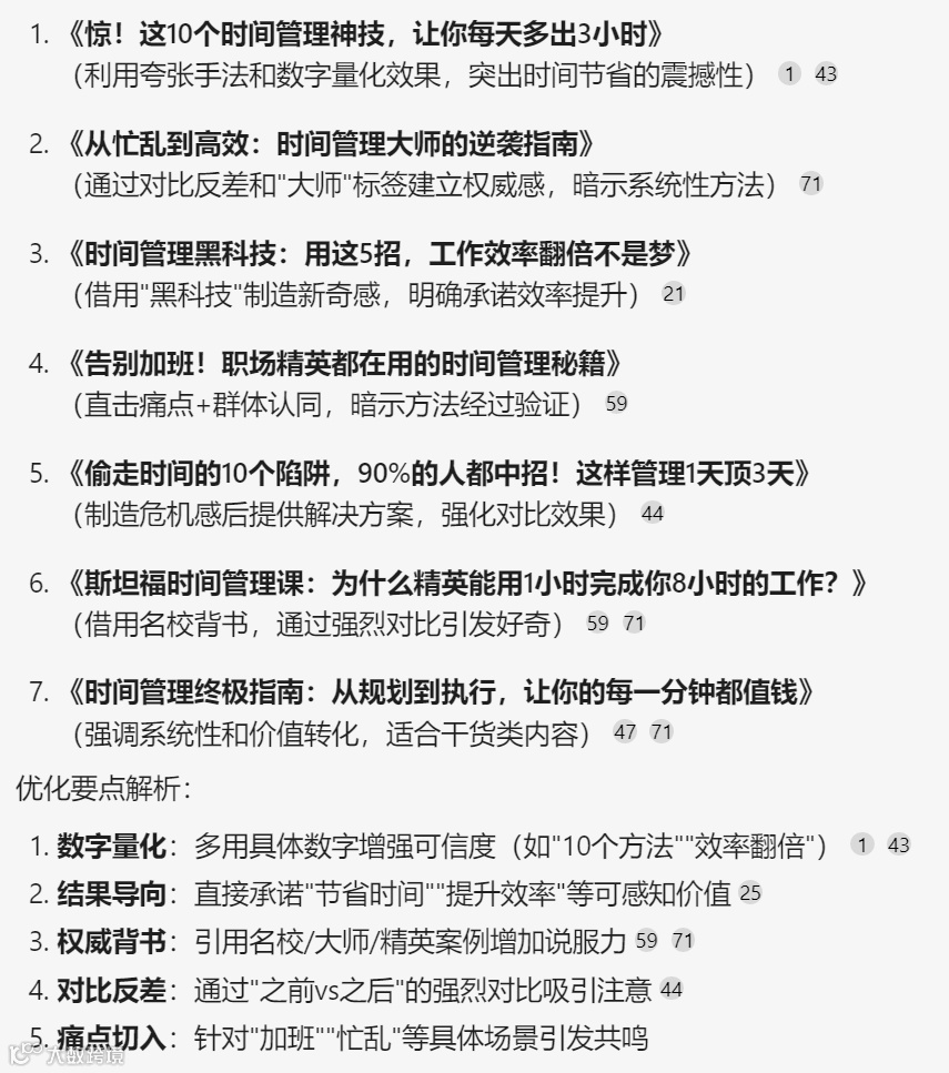 比如你写了一篇关于 “高效时间管理” 的文章,普通标题可能是 “时间管理的方法”,这就太普通了,没人想看。