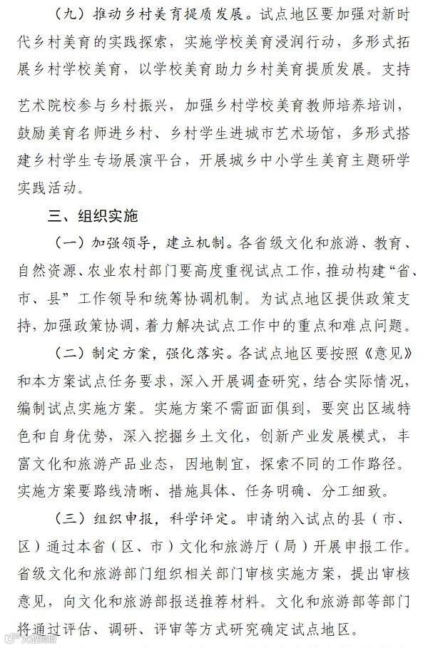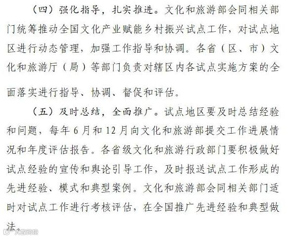 (三)文化和旅游部将会同相关部门统筹推动全国文化产业赋能乡村振兴试点工作,研究确定第二批试点地区,加强试点工作的指导和支持。