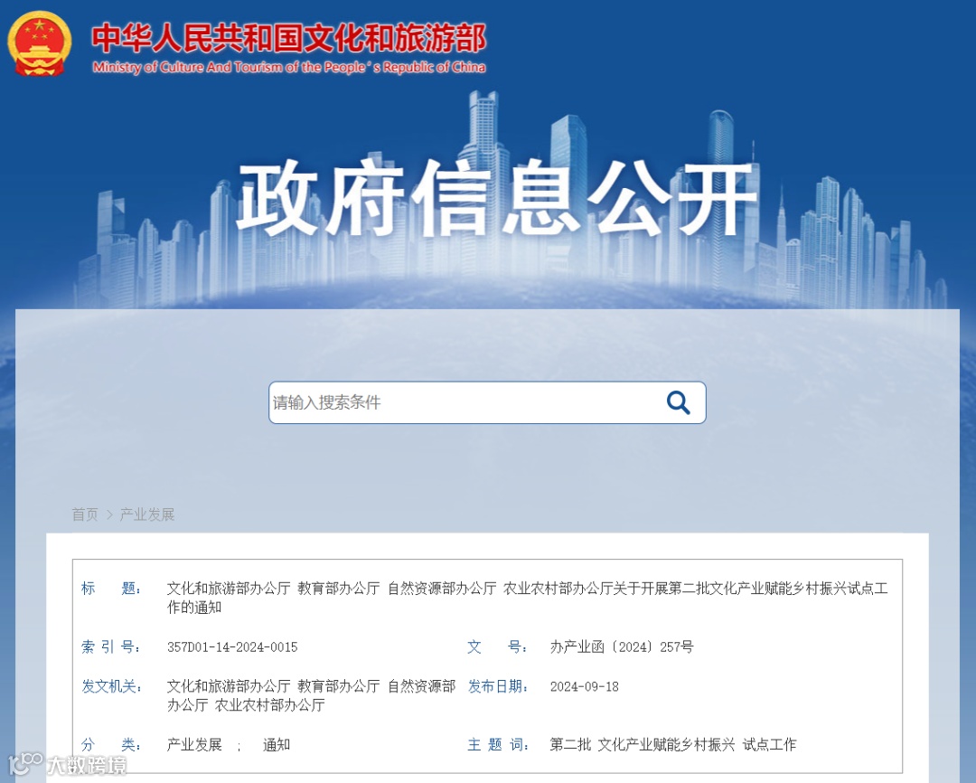 近日,文化和旅游部办公厅、教育部办公厅、自然资源部办公厅、农业农村部办公厅发布关于开展第二批文化产业赋能乡村振兴试点工作的通知。全文如下。