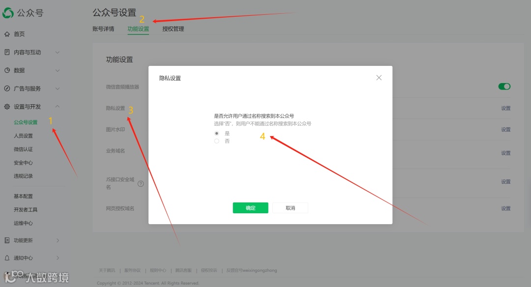解决办法:登录微信公众平台,进入“设置与开发”-“公众号设置”-“功能设置/隐私设置”,检查是否开启了“禁搜”功能。如果开启了,赶紧关闭它,让你的公众号重新“上线”。