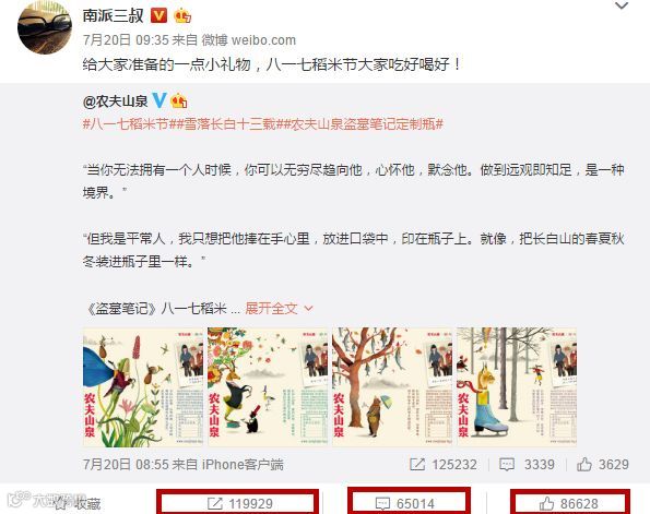 为庆祝8月17日的稻米节(《盗墓笔记》粉丝自发组织的节日),农夫山泉出了款“盗墓笔记定制瓶”,在《沙海》开播当天,农夫山泉在微博公布定制款瓶身图案,稻米会官微和南派三叔先后转发,获得大量《盗墓笔记》粉丝的关注与转发,为农夫山泉定制瓶产品上架做好产品流量经济基础。