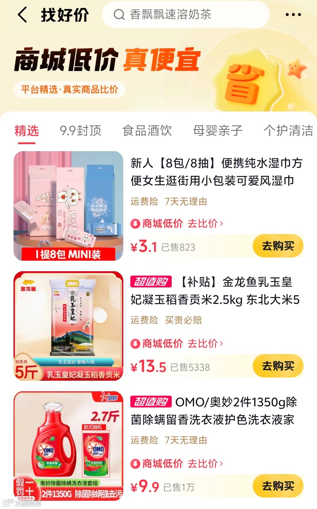 这一频道包括了精选商品、9.9元封顶、女性服装、个人护理与清洁用品、母婴及亲子产品等。