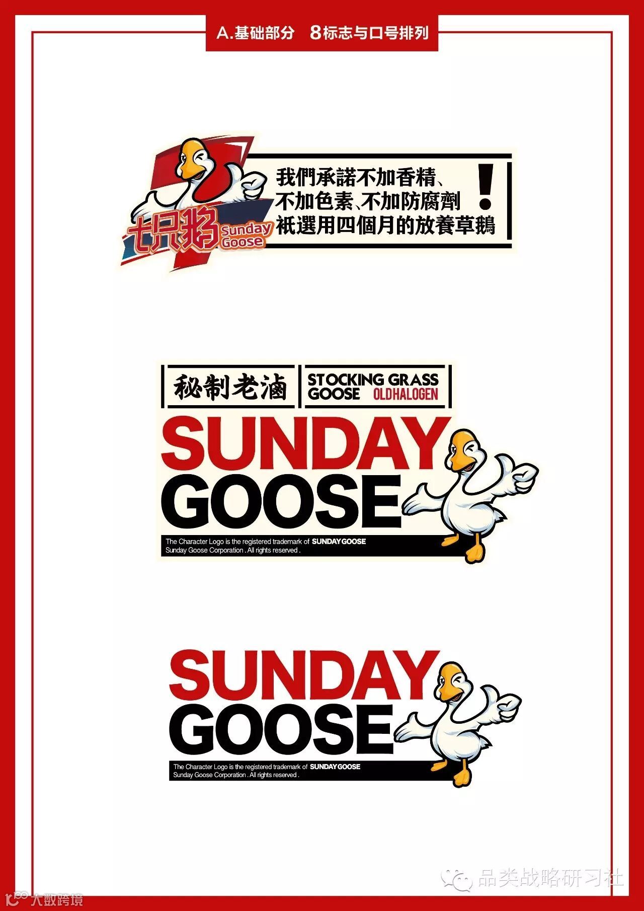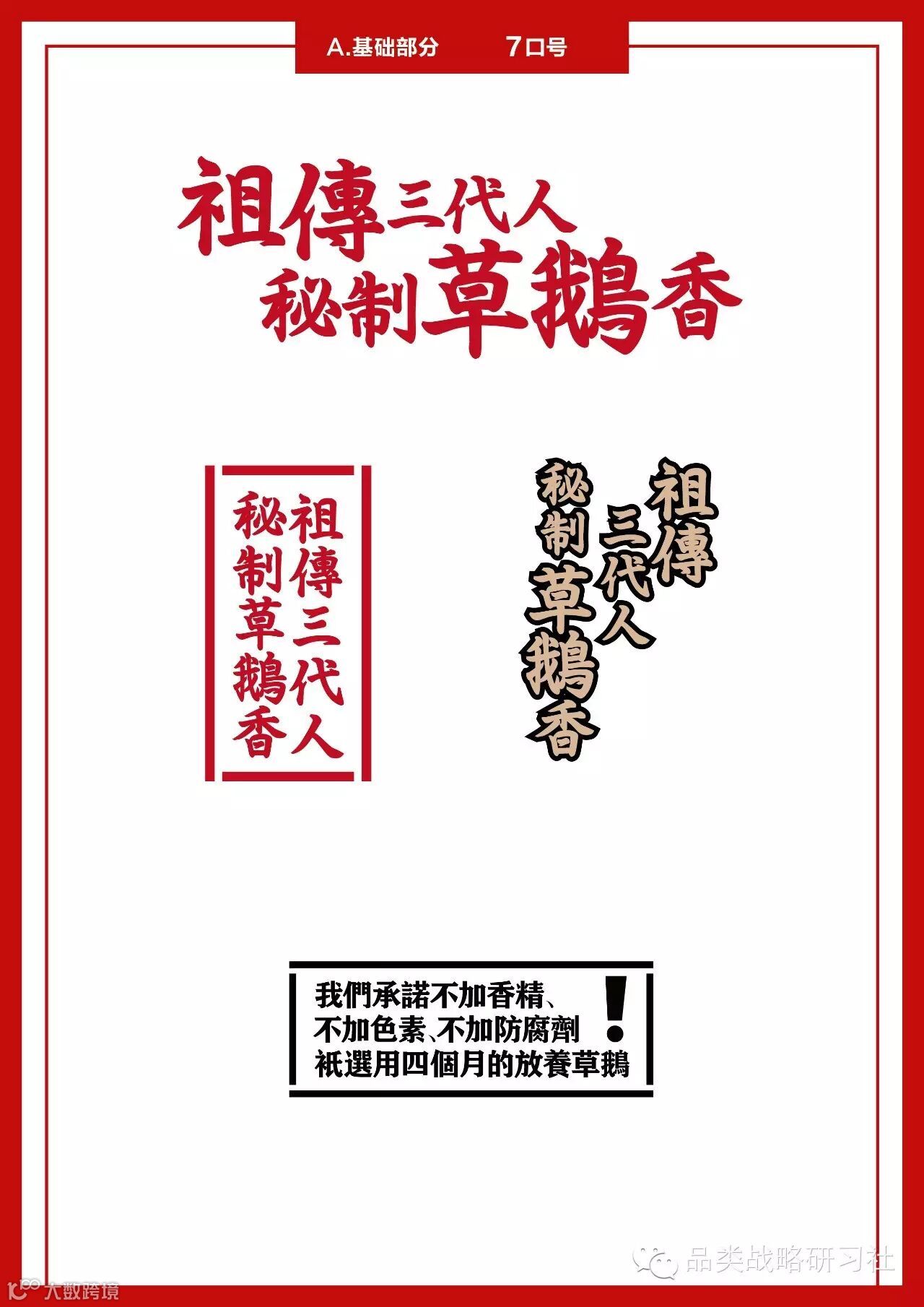 建立品牌的信任度只是第一步,我们还要进一步告诉消费者“我有何不同”,这个不同既要与市面上的其他鹅进行区隔,更要能够有力的打击竞争对手的弱势。我们发现这样的一个事实:过去南京盐水鸭是很好吃的,但现在的盐水鸭味道大不如从前,因为都用速成鸭了,大家都只在价格上竞争。我们的思路相反,我们要做高端卤鹅,绝对不打价格战,我们要在原料上做足文章,顺着这样的思考逻辑,我们进一步找到原料的信任状,即“只选用4个月草养老鹅”,这一点直接针对鸭品类的弱势“速成填鸭”,形成极大的竞争杀伤力。