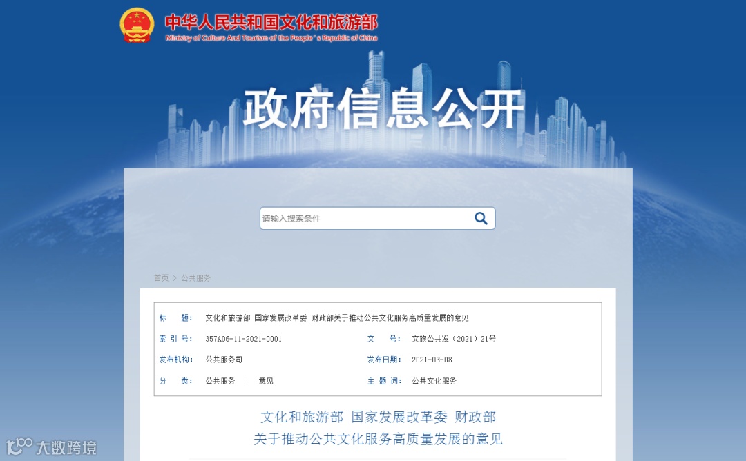 2021年3月8日,文化和旅游部、国家发展改革委、财政部三部委联合印发《关于推动公共文化服务高质量发展的意见》,明确推动公共文化服务高质量发展是深化文化体制改革、保障人民基本文化权益的的必要举措。