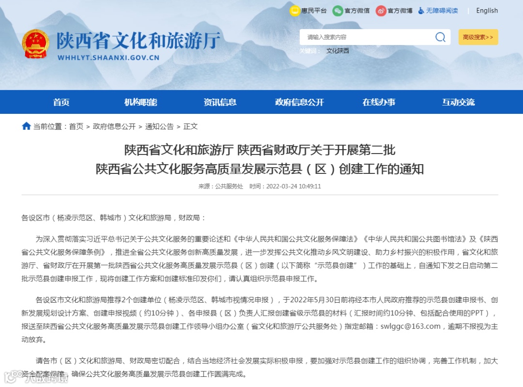 2022年1月25日,陕西省文化和旅游厅、发展和改革委员会、财政厅联合印发《关于推动公共文化服务高质量发展的实施意见》,成为“十四五”期间推动全省公共文化服务高质量发展的指导性文件,对于促进陕西省文化事业繁荣发展、提升人民群众文化获得感具有重要意义。