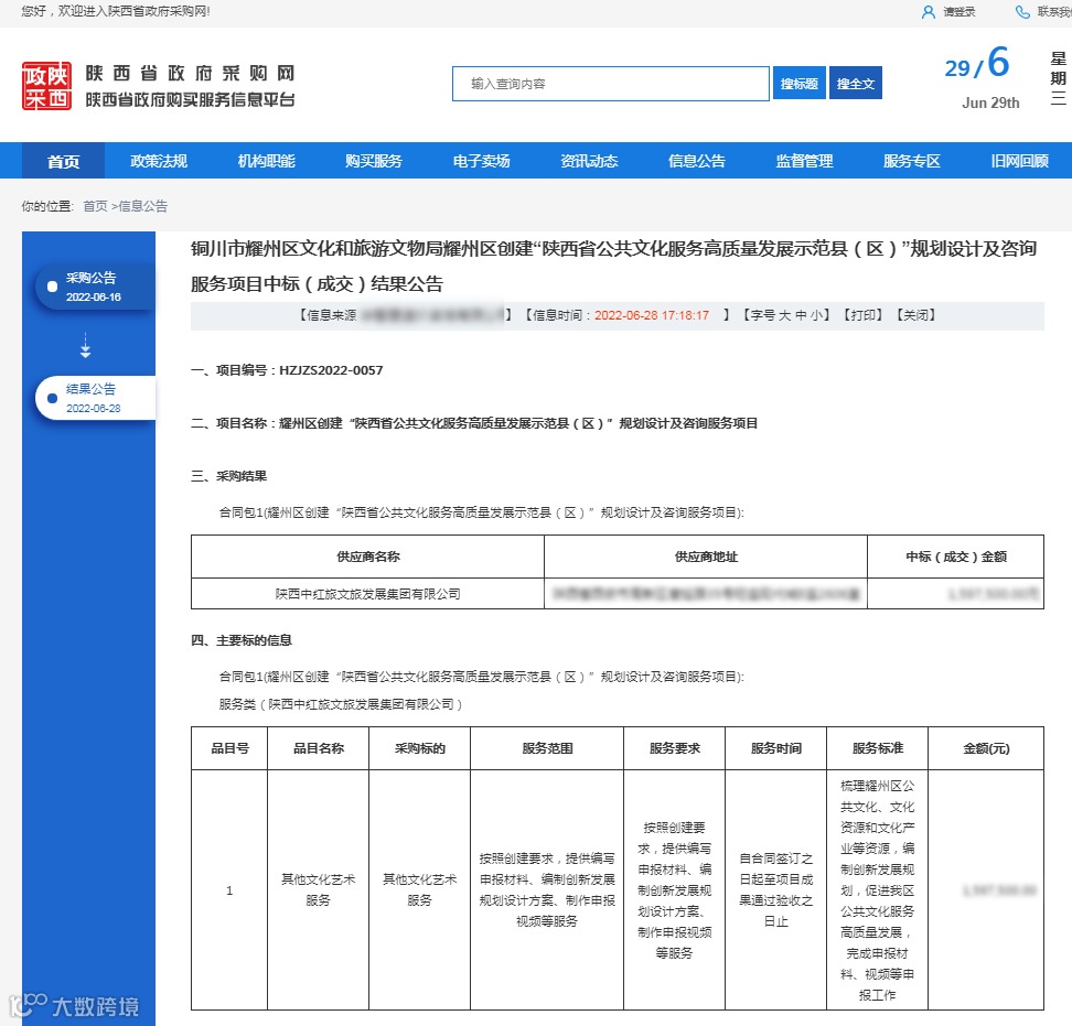 2022年6月28日,中红旅成功中标耀州区创建“陕西省公共文化服务高质量发展示范区”服务项目。