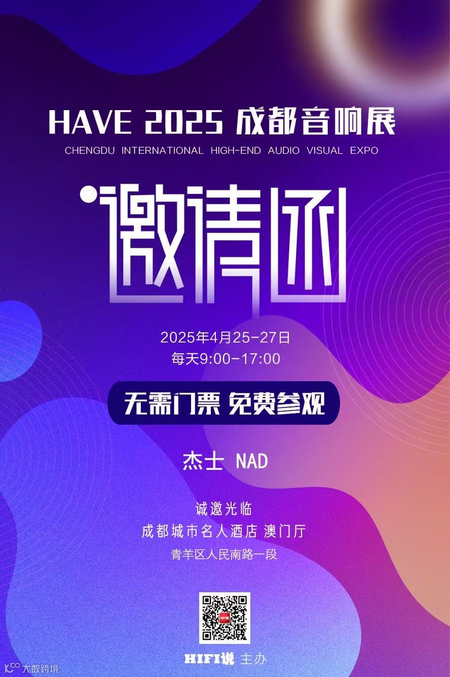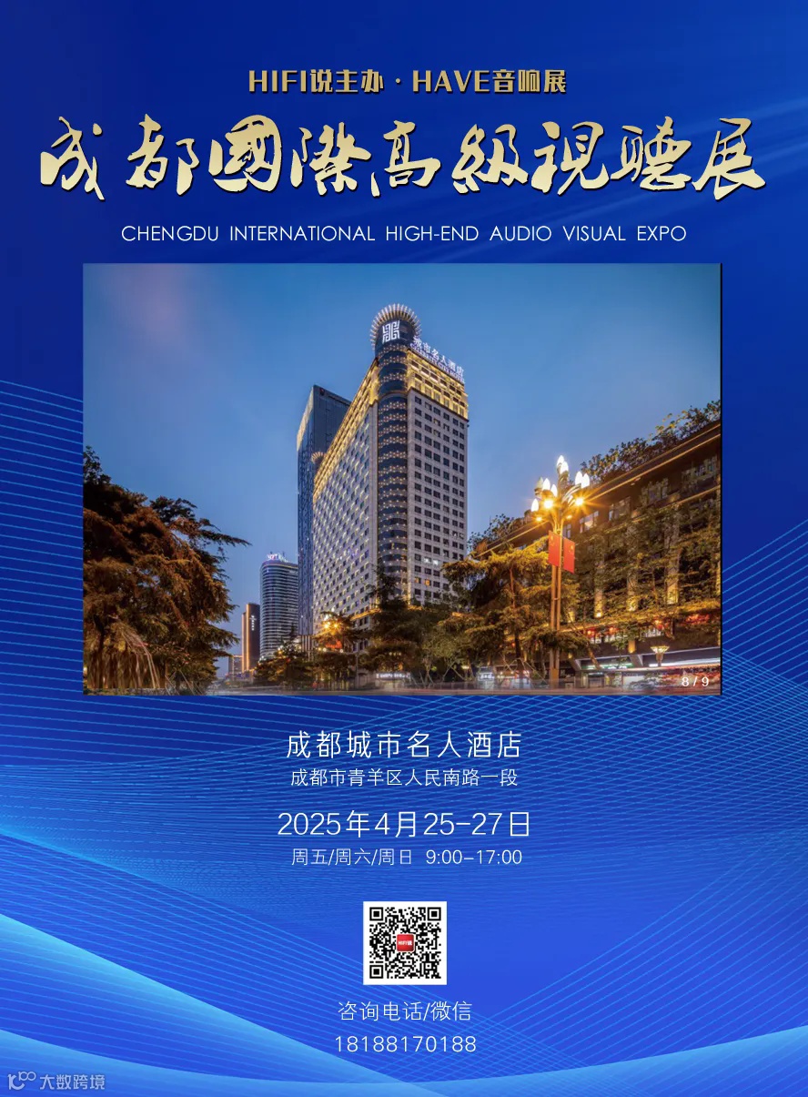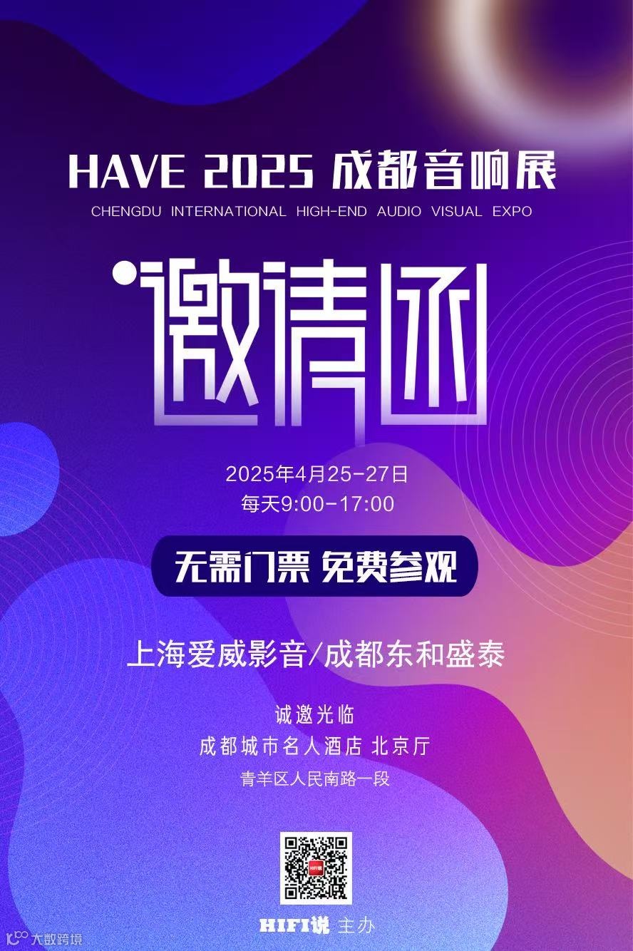 由HIFI说主办的HAVE 2025成都国际高级视听展(简称“成都HAVE音响展”),将于2025年4月25-27日(每天9:00-17:00)在成都城市名人酒店(青羊区人民南路一段122-124号)盛大开幕!